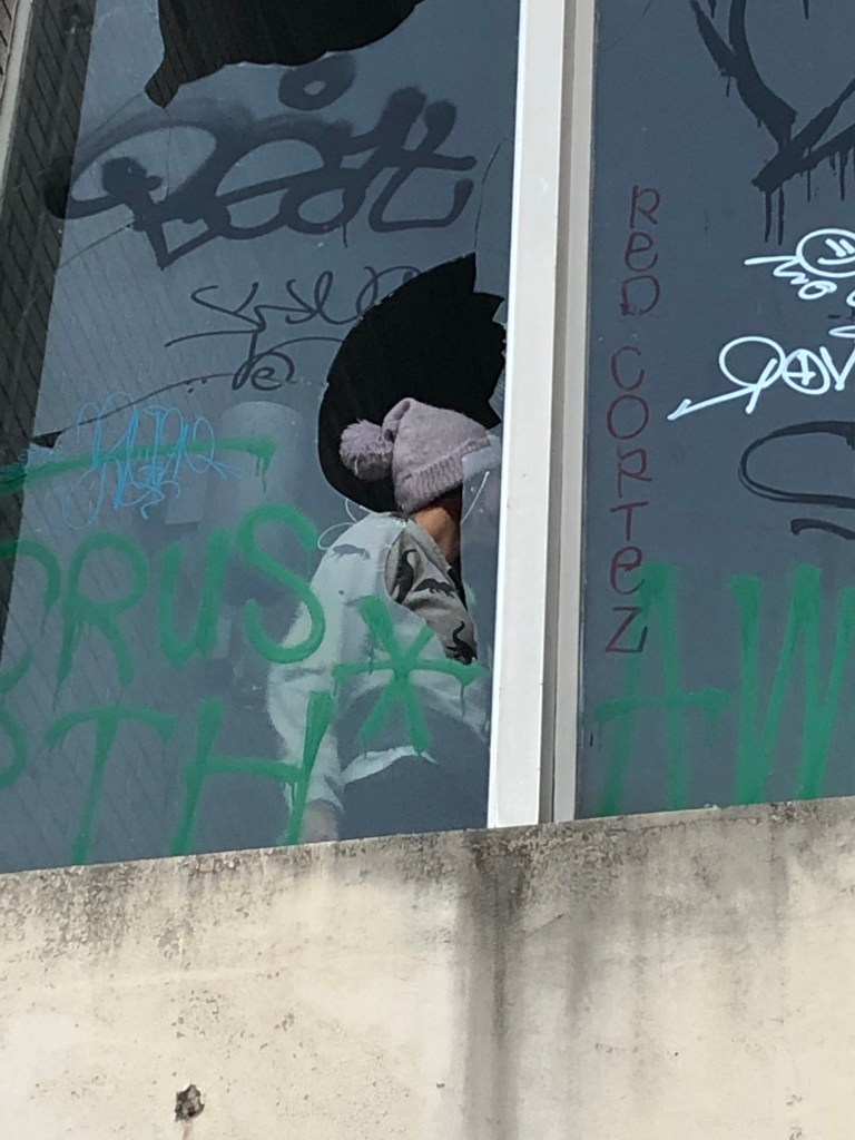 Since I had to pull into the lot to get my bearings straight and check my map, I figured it wouldn’t hurt anything to drive around the back. Wait, isn’t that how many horror flicks and scary movies start?! I never claimed to be a smart woman. After an excited agreement with my travel mate, we decided to get out and poke around the stairways full of broken glass and walls exhibiting some of the most stunning small murals I’d seen in awhile.