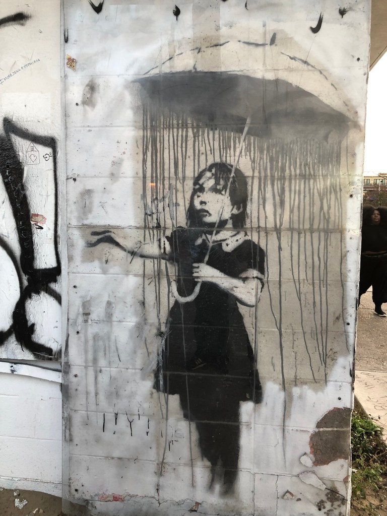 Well know artist Banksy came to New Orleans in 2008, creating 14 paintings around the city, from the Lower Ninth Ward to Uptown but all but by the time I visited, there were 3 remaining. I was able to view 2, one in the Marigny neighborhood (the Rain Girl/Umbrella Girl) and one off of Clio street (the Gray Ghost). Though it bears noting the only one that remains in its original location in 2024 is the Rain Girl or Umbrella Girl.